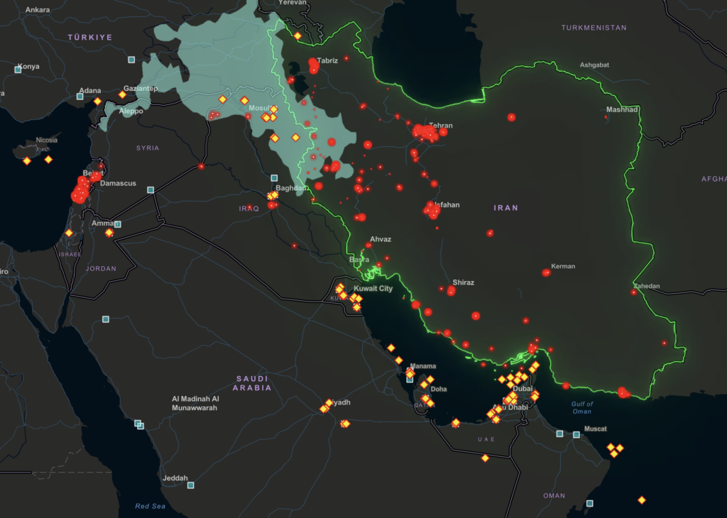 | Görsel 1 Sol: ABD’nin Orta Doğu’da bulundurduğu kuvvetleri. Sağ: Kırmızı işaretli noktalar ABD-İsrail saldırılarını, sarı noktalar İran saldırılarını gösterirken mavi alan yer İsrail Tel Aviv Üniversitesi’ne göre Kürt nüfusunun yayıldığı bölgeyi göstermektedir. (Veriler 8 Mart’a kadardır) Kaynak: Tel Aviv University, The İnstitute for National Security Studies. |
