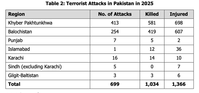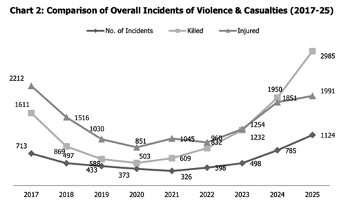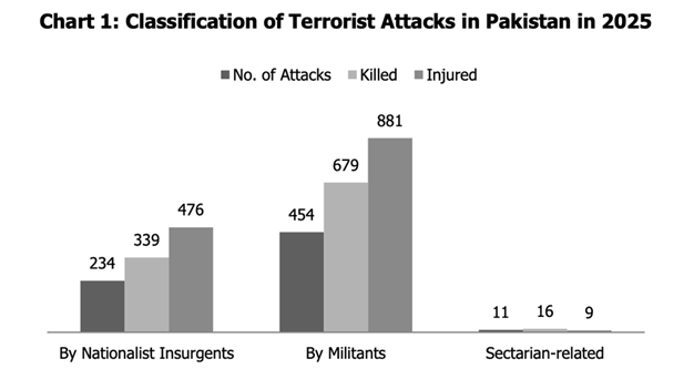 2025 Pakistan Güvenlik Raporu’nda (Grafik 1) 2024 yılına göre terör saldırılarının %34’lük artışı dikkat çekicidir. Grafik 1’de görülen dağılımın en büyük sorumlusu olarak Tehrik-i Taliban Pakistan (TTP) gösterilirken ona bağlı Hafız Gül Bahadır Grubu, Leşker-i İslam (Lashkar-e-Islam, LeI) isimleri de önce çıkmakta.