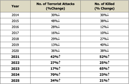 Saldırıların en son 2020’de kısmi düşüşe geçmiş olması ve 2021’den beri yükselmesi, Afganistan’da yönetimi ele alan Taliban’la ilişkilendirilmiştir. Dahası, ABD’nin bölgeden çekilmesiyle boşa çıkan silahların Pakistan’da terör için kullanıldığı CNN tarafından haberleştirilmiştir. Nitekim Pakistan’ın özellikle Afganistan sınırında gerçekçi ve kesin bir önlem alması gerekmektedir. Öte yandann yalnızca terör kaynaklı saldırıların yüzdesel artışını görmek mümkün. (Grafik 3)